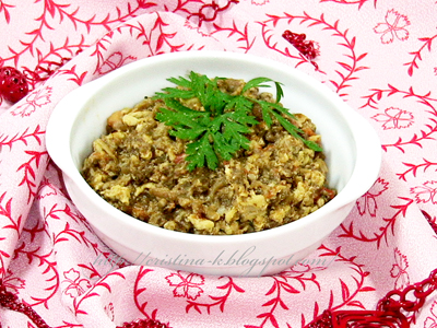 Usturoiul se toaca marunt, apoi se pune intr-o tigaie impreuna cu uleiul si untul. Se pune tigaie pe foc mic-potivit si cand a inceput sa se simta aroma usturoiul se adauga vinetele si se calesc putin (1~2 min.), se adauga apoi rosiile, sarea si piperul si se caleste pana se absoarbe aproape toata zeama lasata de rosii. Se adauga ouale batute si se caleste in continuare amestecand usor pana ce acestea din urma s-au facut. Se adauga si pudra de cumin (cine doreste), se mai amesteca de vreo 2 ori si se trece pe farfurie...